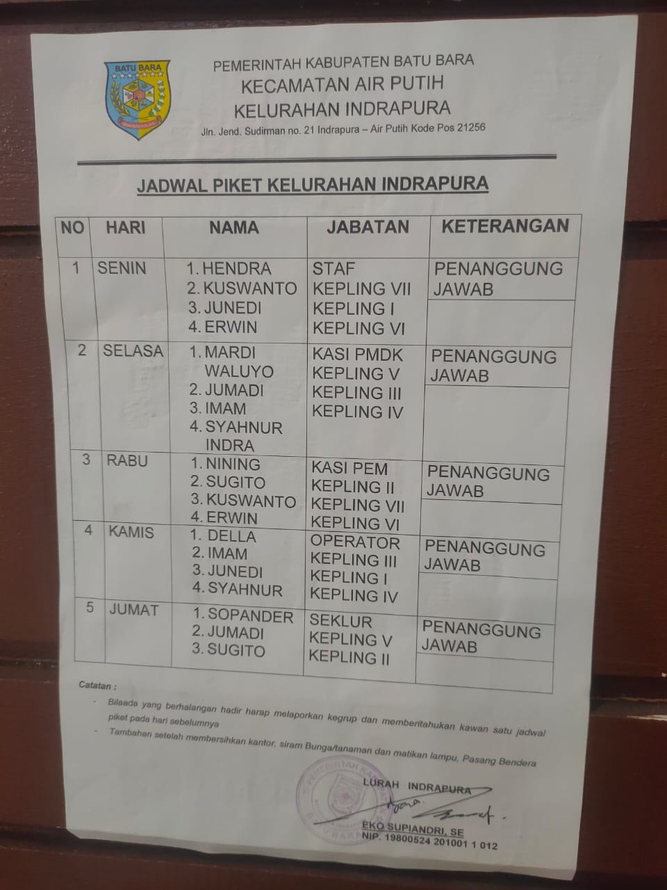 Persoalan ini bermula saat giliran jam piket Imam dan Erwin di Kantor Lurah Indrapura. Namun, keduanya diduga tidak hadir untuk melaksanakan piket tersebut. Menanggapi hal ini, Lurah Indrapura kemudian membuat aturan tegas bahwa setiap Kepling wajib masuk ke Kantor Lurah Indrapura sesuai jadwal piket masing-masing.