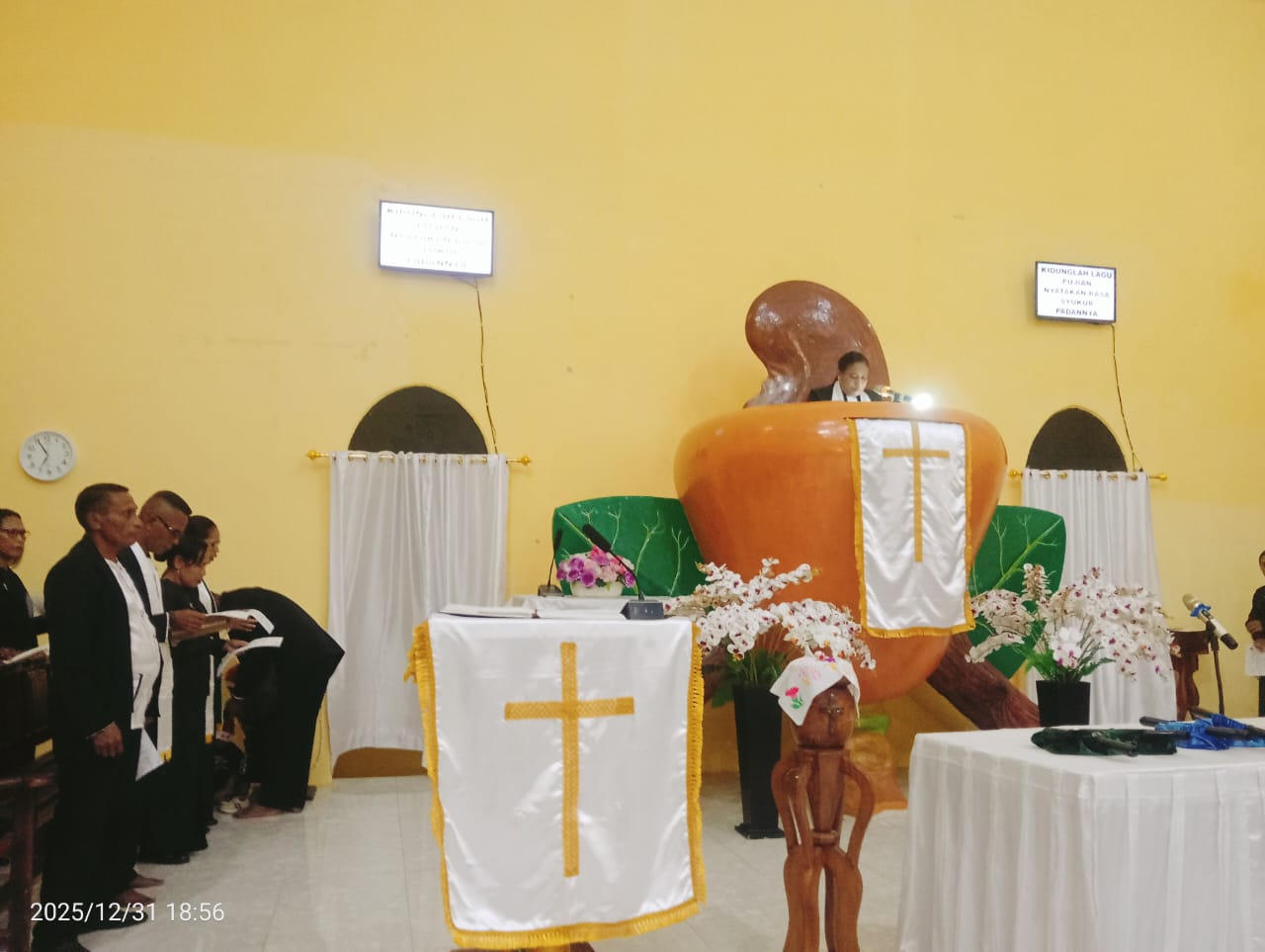 Ibadah akhir tahun tersebut dipimpin oleh Pendeta Ny. B. Rumheng/U. S.Si dan berlangsung dari pukul 19.00 hingga 20.00 WIT. Suasana ibadah berjalan tertib, aman, dan penuh kekhusyukan.