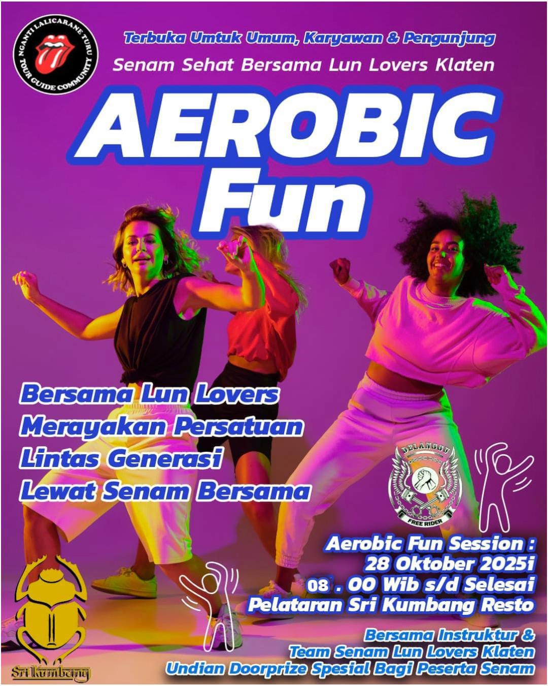 Mengusung semangat Sumpah Pemuda, pada 28 Oktober mendatang Lun Lovers berkolaborasi dengan Sri Kumbang Group dan Ngantilalicaraneturu Tour Guide Community Klaten untuk menyelenggarakan Senam Aerobik Bersama di pelataran Sri Kumbang. Acara akan dimulai pukul 08.00 WIB dan dipersiapkan sebagai perayaan persatuan lintas generasi. Tajuk acara yakni , “Bersama Lun Lovers Merayakan Persatuan Lintas Generasi Lewat Senam Sehat”, menguatkan niat untuk menjadikan olahraga kolektif sebagai medium peringatan yang bermakna, bukan seremonial semata.