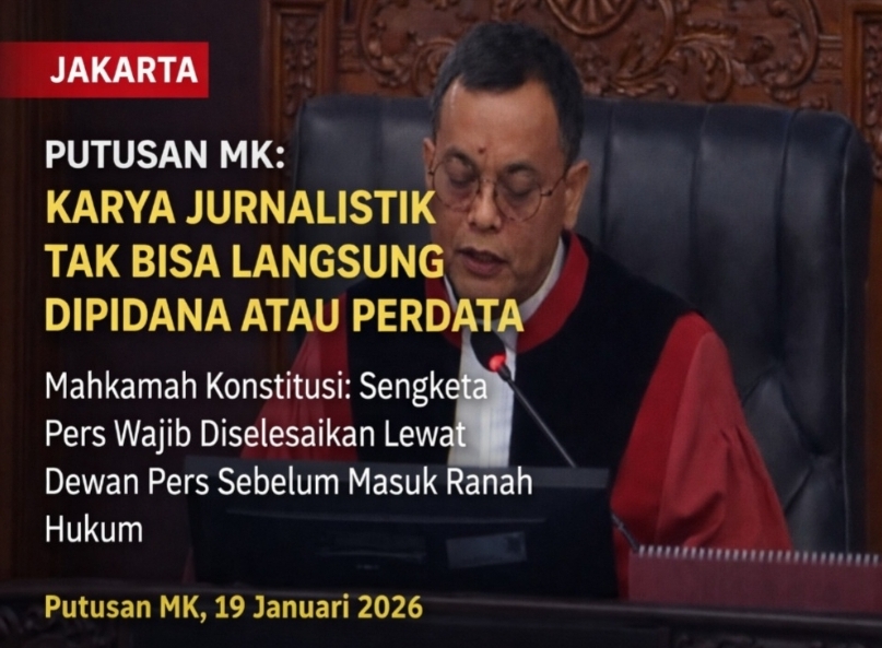 Mahkamah Konstitusi (MK) menegaskan bahwa karya jurnalistik wartawan tidak bisa langsung dituntut secara pidana maupun perdata. Sengketa yang muncul dari produk jurnalistik wajib diselesaikan terlebih dahulu melalui mekanisme Dewan Kehormatan Pers (DKP) sesuai Undang-Undang Nomor 40 Tahun 1999 tentang Pers (UU Pers).