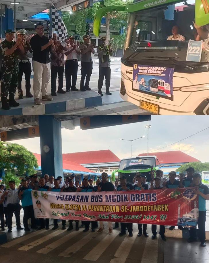 Sore ini suasana di Terminal Ir. Soekarno Klaten dipenuhi haru dan semangat. Sebanyak sebelas unit bus disiapkan untuk berangkat menuju TMII Jakarta guna menjemput ratusan perantau asal Klaten yang merantau di berbagai daerah Jabodetabek (Jakarta,Bogor,Depok, Tangerang Bekasi) yang akan mudik secara gratis melalui program mudik yang digagas Pemerintah Kabupaten Klaten. Pelepasan armada berlangsung sederhana namun khidmat, dihadiri langsung oleh Bupati Klaten Hamenang Wajar Ismoyo, dan jajaran Forkopimda Kepala Dinas Perhubungan, Kepala Satlantas Klaten bersama beberapa pejabat terkait lainnya (14/03/2026).