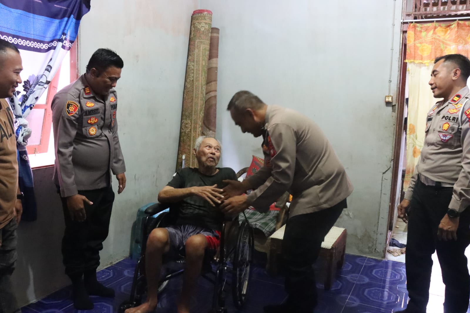 Saat rombongan Kapolres tiba, Bapak Joko tampak terkejut sekaligus haru menerima kursi roda tersebut.