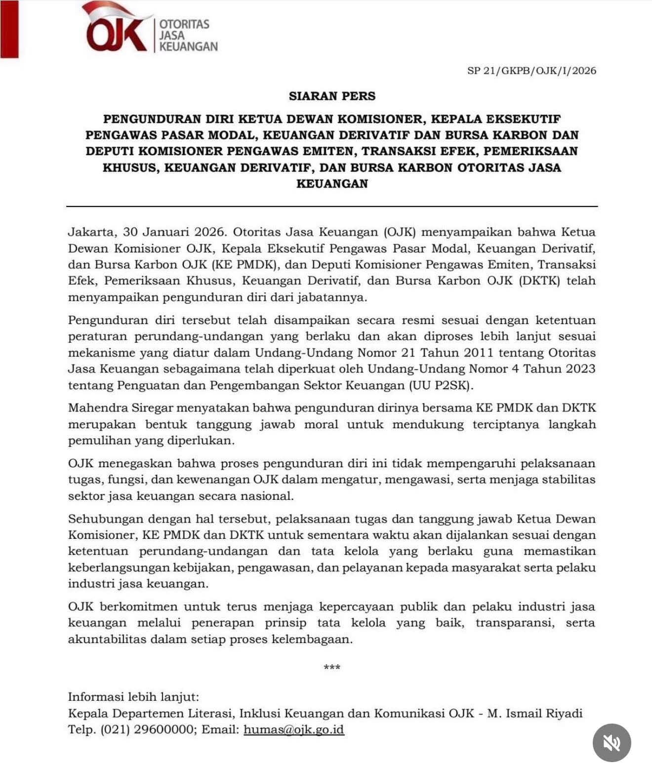 Pengunduran diri beberapa pejabat puncak Otoritas Jasa Keuangan (OJK) pada akhir Januari 2026 memicu gelombang kecemasan di pasar modal. Kejadian yang berpuncak pada pengumuman mundurnya Ketua Dewan Komisioner OJK, Mahendra Siregar, pada 30 Januari 2026, diikuti oleh pengunduran diri Wakil Ketua Mirza Adityaswara, meninggalkan ruang hampa kepemimpinan di lembaga yang selama ini menjadi benteng pengawasan sektor keuangan. Di tengah tekanan pasar yang sudah sensitif, pengumuman tersebut menjadi pemicu lonjakan volatilitas yang terasa hingga ke meja investor ritel di Klaten dan manajer portofolio di Jakarta (31/01/2026).